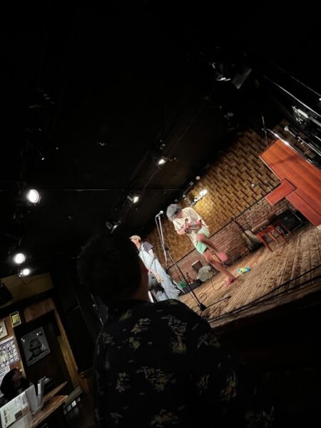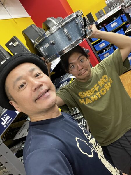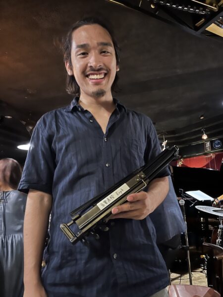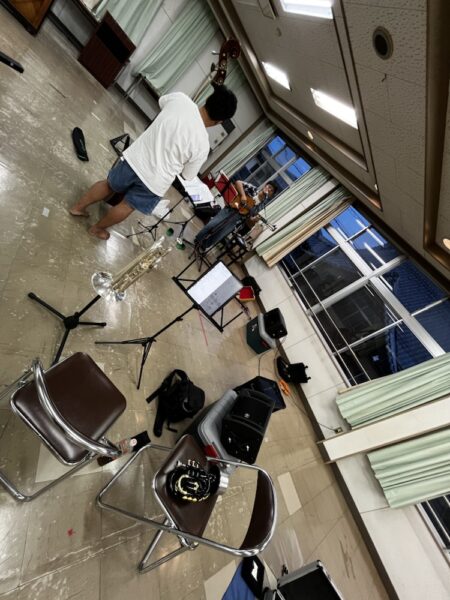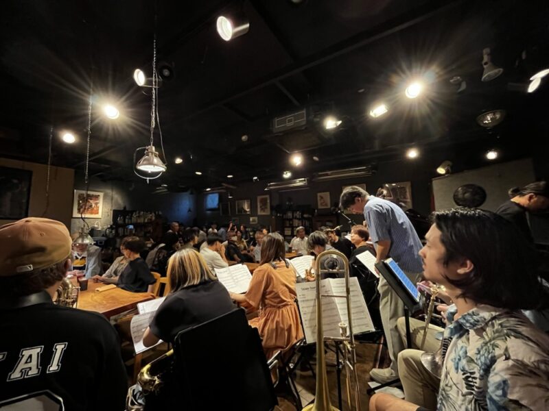ジャズバーでビッグバンドをやるときは大体狭いですが、今回はなんとカウンターをひとつ取っ払ってくれたとかで、広々としておりました。そして、自分専用の充電式サーキュレーターも大活躍でございます。この夏の一番良い買い物になりました。リハの後、ハードオフに行くとつるのりバンドのこだまくんがおりました。ウケる。