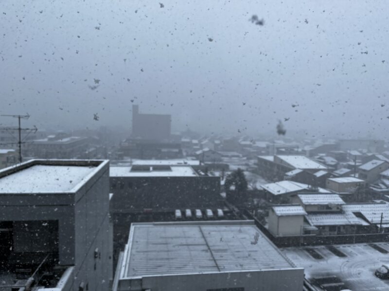 朝起きて、カーテンを開けたらガッツリと雪が降っておりました。「これは、帰れるかしら。。。帰れなくなっても楽しいけど」とか思いましたが、天気予報は午後から晴れマークでした。